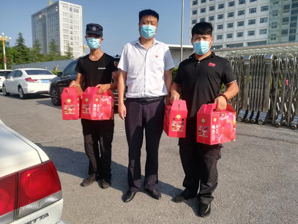 8月9日、10日北關(guān)區(qū)總工會副主席薛梅、保障部部長司尚雯來到安陽市洹河保安服務有限責任公司,送來抗洪防疫慰問品鮮桃500多箱,向堅守崗位、奮戰(zhàn)一線的保安隊員進行慰問,提醒大家做好防控工作的同時一定要做好自身防護。