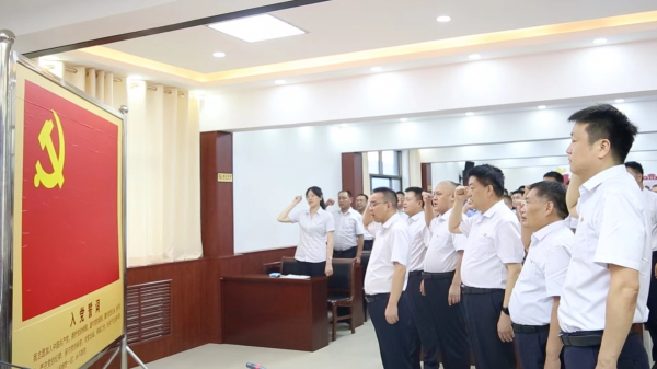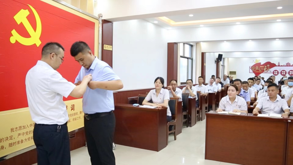 接著,在王高峰同志帶領下,面向鮮紅的中國共產(chǎn)黨黨旗,新、老黨員舉起右拳、莊嚴宣誓,鏗鏘有力的誓言響徹會場,短短80個字的入黨誓詞,震撼著現(xiàn)場每一位黨員。