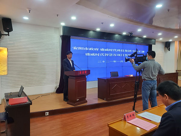 2021年1月13日上午,盛威時代智慧谷項目簽約儀式在市黨政綜合樓2樓第5會議室舉行,市政府、盛威集團、安陽戰(zhàn)新基金、示范區(qū)管委會、經(jīng)開集團等單位的主要領導參加簽約儀式。儀式由市政府秘書長李傳銀主持,常務副市長陳志偉代表市政府簽約,袁家健市長致辭,齊方董事長代表經(jīng)開集團出席簽約儀式。