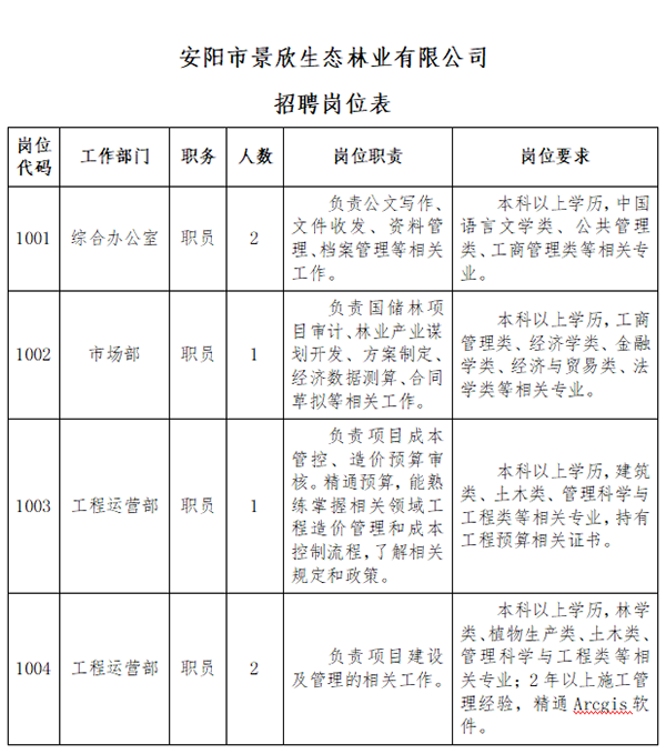 安陽市景欣生態(tài)林業(yè)有限公司(以下簡稱“景欣林業(yè)”)是安陽市國家儲備林建設(shè)PPP項目公司,根據(jù)工作發(fā)展需要,擬委托安陽鼎泰勞務(wù)派遣有限責(zé)任公司(以下簡稱“鼎泰公司”)面向社會公開招聘6名工作人員。現(xiàn)將有關(guān)事項公告如下: