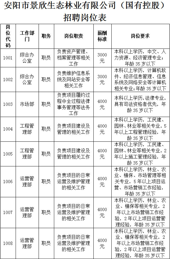 根據(jù)工作發(fā)展需要,現(xiàn)委托安陽鼎泰勞務派遣有限責任公司面向社會公開招聘8名員工,派遣至安陽市景欣生態(tài)林業(yè)有限公司工作?,F(xiàn)將有關(guān)事項公告如下: