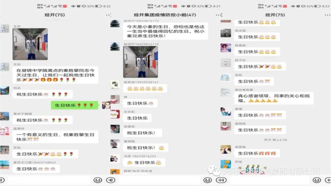 1月25日,是經(jīng)開集團(tuán)志愿者秦勝攀34歲的生日。在晝錦中學(xué)隔離點(diǎn),他向往常一樣重復(fù)著為隔離人員配送生活物資、清理垃圾、環(huán)境消殺等工作。下班后在宿舍出現(xiàn)了暖心的一幕:在這個(gè)特殊的時(shí)期、特殊的地方、特殊的環(huán)境,沒有蠟燭、沒有蛋糕,但有特殊的“家人”陪他一起過生日。“家人”們紛紛表示愛心,送上了溫暖的祝福。