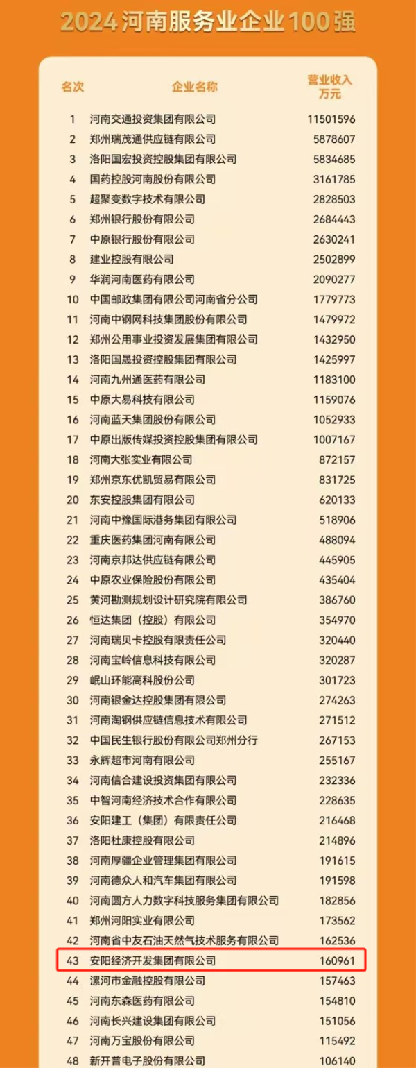 近日,集團(tuán)在河南企業(yè)100強(qiáng)高峰會(huì)上入選“2024河南服務(wù)業(yè)企業(yè)100強(qiáng)”,位列榜單第43位,這是集團(tuán)連續(xù)第3年獲此榮譽(yù)。