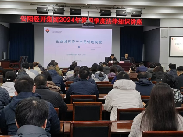 12月25日上午,河南興鄴律師事務(wù)所劉濤律師應(yīng)集團邀請在市財政局綜合會議室,以“企業(yè)國有資產(chǎn)交易與管理制度”為主題,為集團全體員工進行法律知識宣講。集團黨委委員、監(jiān)事長謝俊生主持本次講座,集團領(lǐng)導(dǎo)班子成員及全體員工參加了講座。